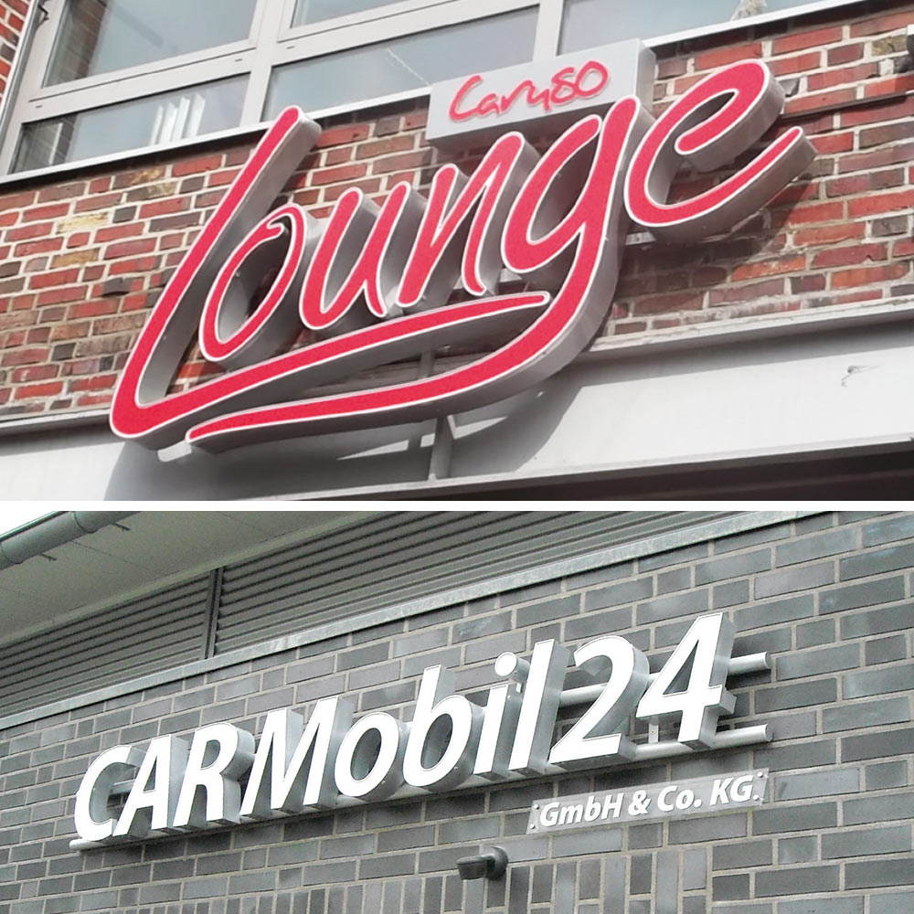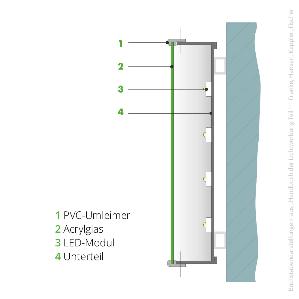 Mehrteiliger Vollreliefbuchstabe aus Aluminium. Pulverbeschichtet in Standardfarben bzw. lackiert nach RAL. Acrylglasspiegel mit frontaler Ausleuchtung mit innenliegenden LEDs. Gehalten von farbigem Kunststoffprofil